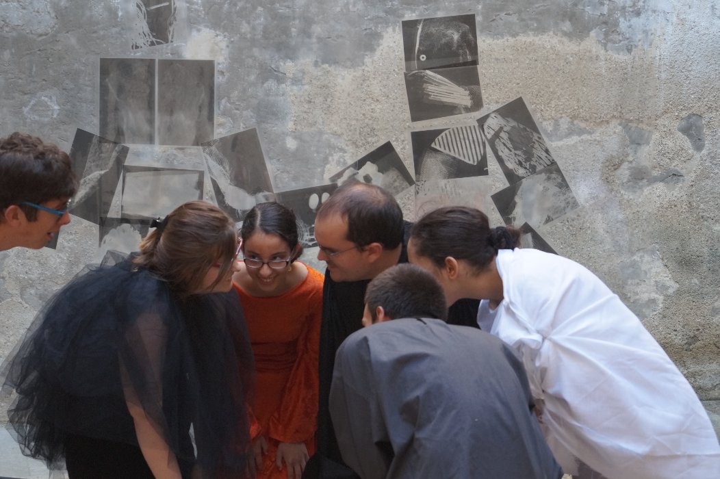 These figures also populated the scenery that was designed for the Commanderie de Ste Luce courtyard and created by the pupils with the Public Service Department intermediary. Almost ten sessions were required to make the seven scenery panels. Each one represented the character imagined by the actor who embodied it. The bodies were created as a photogram, one fragment at a time. The choice of this technique, which makes it possible to achieve a photograph by placing an object between the sensitive paper and the light source, links the museum’s photography collection and the workshops held by the Public Service Department. These photograms were then printed on transparent sheets mounted on plastic media. Hanging from cables in the courtyard of Ste Luce, these panels were slid along in tune with the story enacted by the company.