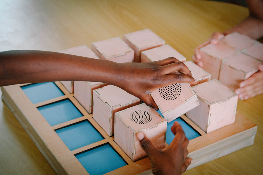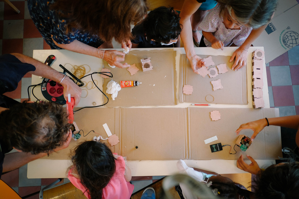 The sounds in the cubes were recorded during a sound workshop with children from a school in Arles. In the same way, the game has been built collectively during an electronics workshop.